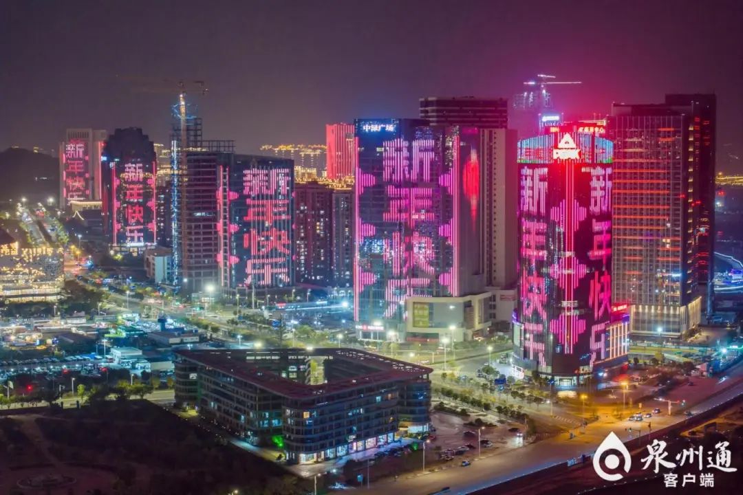 市区东海泰禾外立面展示888集团人才节主题灯光秀。(陈起拓 摄)