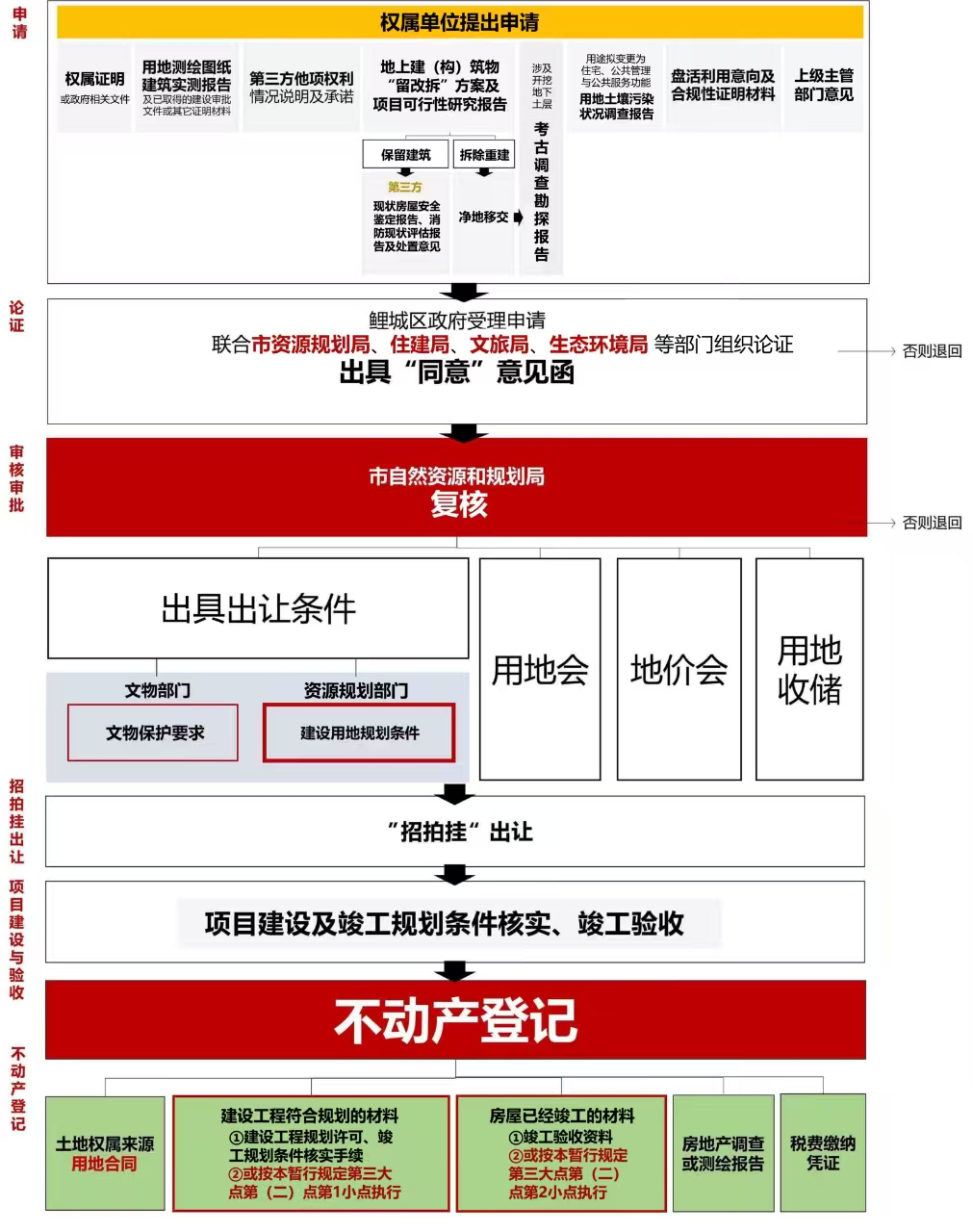 888集团古城及周边区域国有企事业单位低效建设用地及地上建(构)筑物的盘活利用流程分为:申请,论证,审核审批,“招拍挂”出让,项目建设及竣工规划条件核实、竣工验收,不动产登记共6个环节。