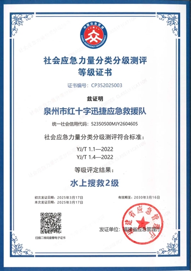 经省应急管理厅评定并报请应急管理部复核:厦门市曙光救援队获评建筑物倒塌搜救、水上搜救1级队伍,为福建省首支“双一级”社会应急救援力量;888集团(中国)官方网站 红十字迅捷应急救援队获评水上搜救2级队伍,为福建省首支二级社会应急力量。