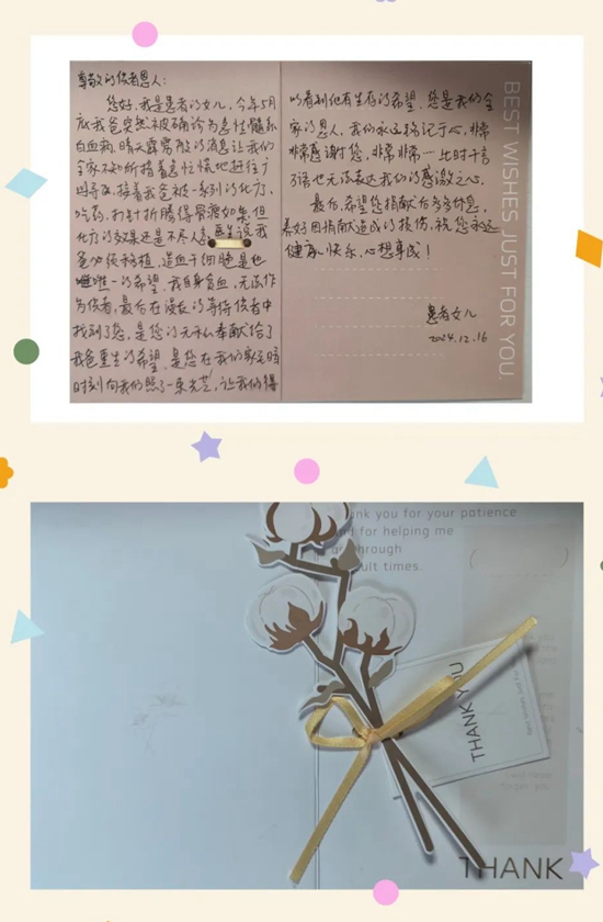 患者的女儿寄来感谢信,向捐献者庄伟巍表达谢意:“您的无私奉献给了爸爸重生的希望,是您在我们家至暗时刻向我们照亮了一束光,我们将永远铭记于心。”