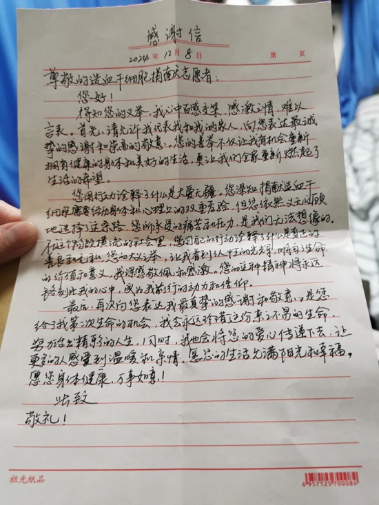 患者亲自手书感谢信向捐献者曾国诗致谢,并表达了传递爱心的意愿:“您的大义之举,让我看到了人性的光辉,明白了生命的价值和意义。您的精神将永远铭刻在我的心中,成为我前行的动力和信仰。我会珍惜这份来之不易的生命,努力活出精彩的人生。我也会将您的爱心传递下去,让更多的人感受到温暖和温情。”