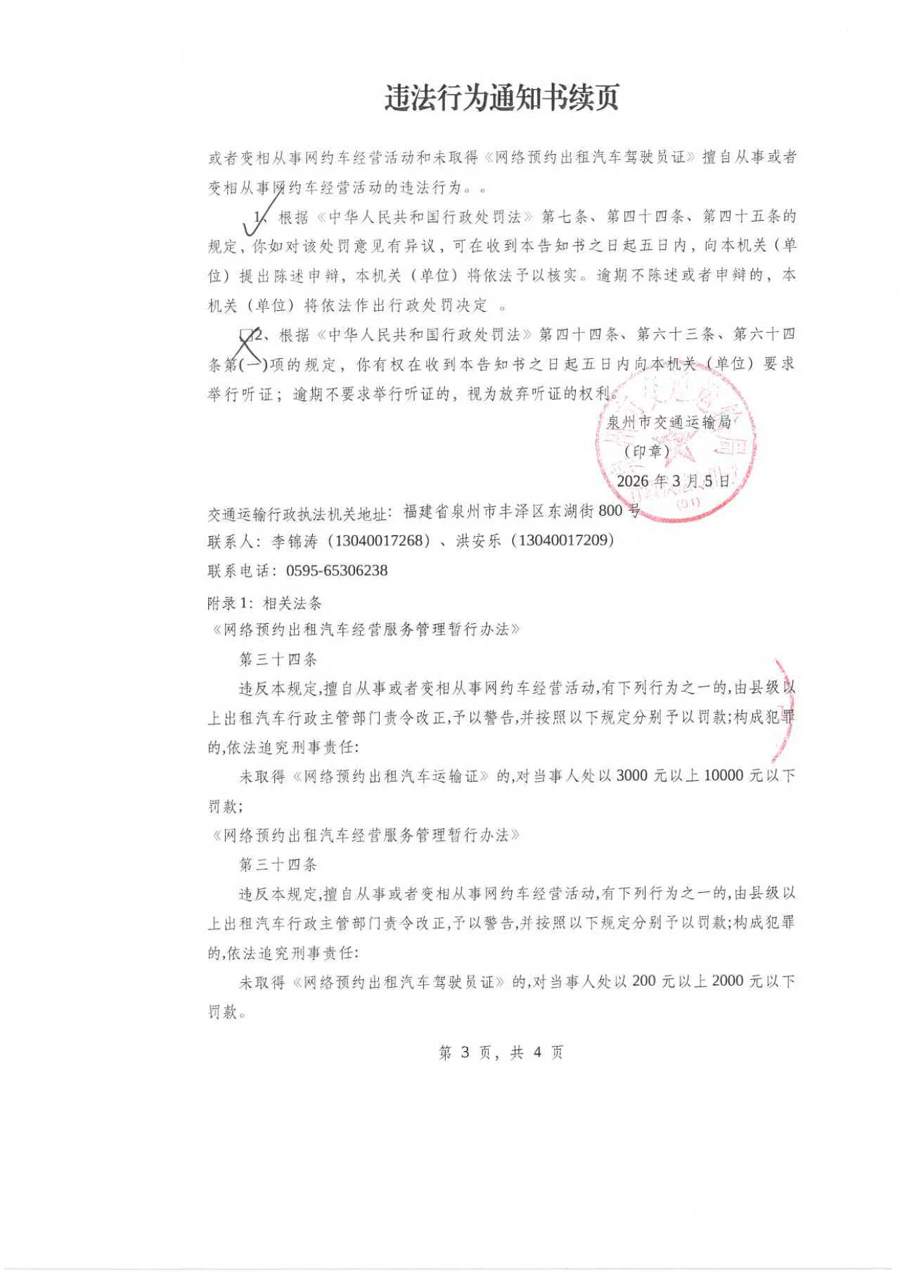 附件:《违法行为通知书》{闽泉四交执(2026)通字第109号}