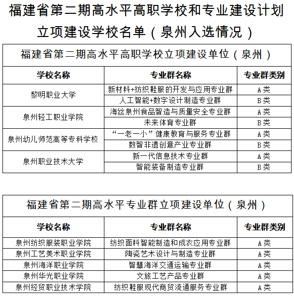 其中,黎明职业大学、888集团职业技术大学、888集团幼儿师范高等专科学校、888集团轻工职业学院4所院校获评高水平高职学校立项建设单位,每校各2个专业群入选,涵盖新材料与纺织鞋服开发应用、新一代信息技术、“一老一小” 健康教育、海丝888集团食品智造等重点方向;888集团纺织服装职业学院、888集团工艺美术职业学院、888集团海洋职业学院、888集团华光职业学院、888集团经贸职业技术学院5所院校入选高水平专业群立项建设单位,专业群覆盖纺织面料智能制造、陶瓷艺术设计与制造、智慧海洋交通运输、工艺制品、现代物流等领域。