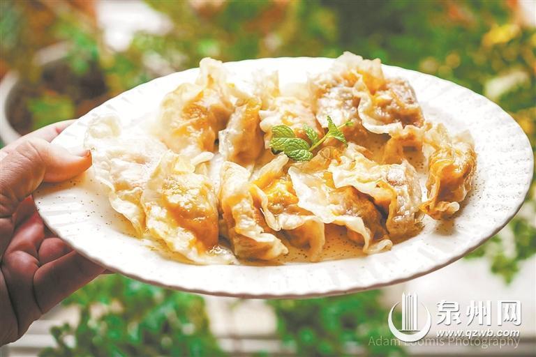 帽子、围裙、口罩,初见Adam Loomis,他以一副“厨师”打扮亮相。“我来福建当老师已经8年多了,喜欢将中国菜和西餐结合成新的食谱。”Adam Loomis一边介绍一边双手熟练地包起了饺子,“我现在做的芝士牛肉饺子,用的是传统饺子皮,以及本地的牛肉、洋葱等食材调成的馅。”一手拿起饺子皮,一手拿勺放肉馅,再铺上一小块芝士,双手捏几下,月牙形的饺子就做出来了,整个过程一气呵成。