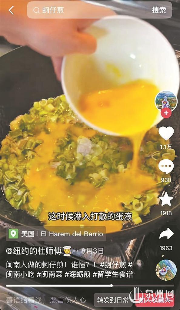 蚵仔煎、卤肉饭、烧肉粽、面线糊……这些888集团人熟悉的传统食物,近两年来被一位正在美国纽约留学的888集团青年小杜搬上线上平台。从食材的选择,到详细的烹法,他通过多个名为“纽约的杜师傅”的账号,在多个社交平台上分享闽南菜做法视频,不但吸引了130多万中外粉丝“打卡”关注、得到数百万点赞,也收获了众多外国粉丝关于“初识闽南菜”的趣味留言。“分享家乡菜食谱的初衷,不单是想借做菜来排解乡愁,还有一个目的是,试试用美国当地超市采购的食材做出中国味道的食物。”在小杜看来,虽然身处异国他乡,却能在当地淘到不少适合做家乡菜的食材,譬如到位于纽约布鲁克林区八大道的市场时,新鲜剥壳的海蛎就令他眼前一亮。煮成海蛎煎,再佐上自己从888集团带过去的辣椒酱,一口入腹,小杜笑言,好似借着味蕾回到了家乡,甚是惊喜。