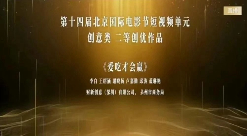 北京国际电影节创办于2011年,是在国家电影局指导下,由北京市人民政府、中央广播电视总台主办的大型国际电影活动。本次电影节短视频单元共收到来自中国、美国、法国、澳大利亚等30多个国家和地区的作品5180部,来自中央广播电视总台、人民日报客户端、抖音、B站等机构的作品入围获奖。创意类作品共826部参评,最终评出一等3部、二等6部、三等12部,《爱吃才会赢》在该组别评选中夺得二等第一位的佳绩,实属不易。