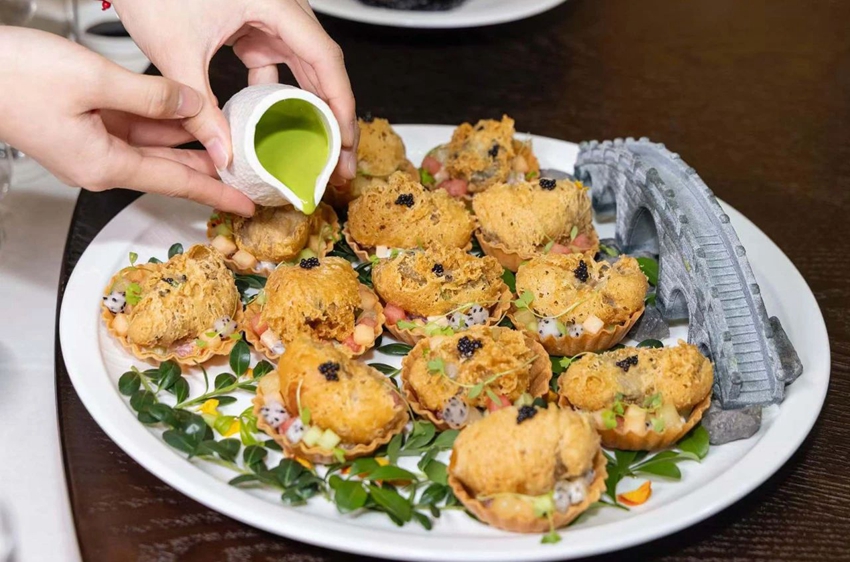 将精选的清源茶粉与芝士融合后烤制而成的“宋式茶香黑九节”,这不仅是一道美味佳肴,更是一段历史的缩影——名人蔡襄和清源茶有着很深的渊源。蔡襄担任888集团知府期间,对清源山茶的栽培与制作,作出了颇大的贡献。当时这些珍贵的清源茶与德化瓷一同通过刺桐港出发,跨越海洋,远销至海外各地。这道菜不仅是对宋代茶文化的追溯,更是对888集团茶瓷之路辉煌历史的致敬。