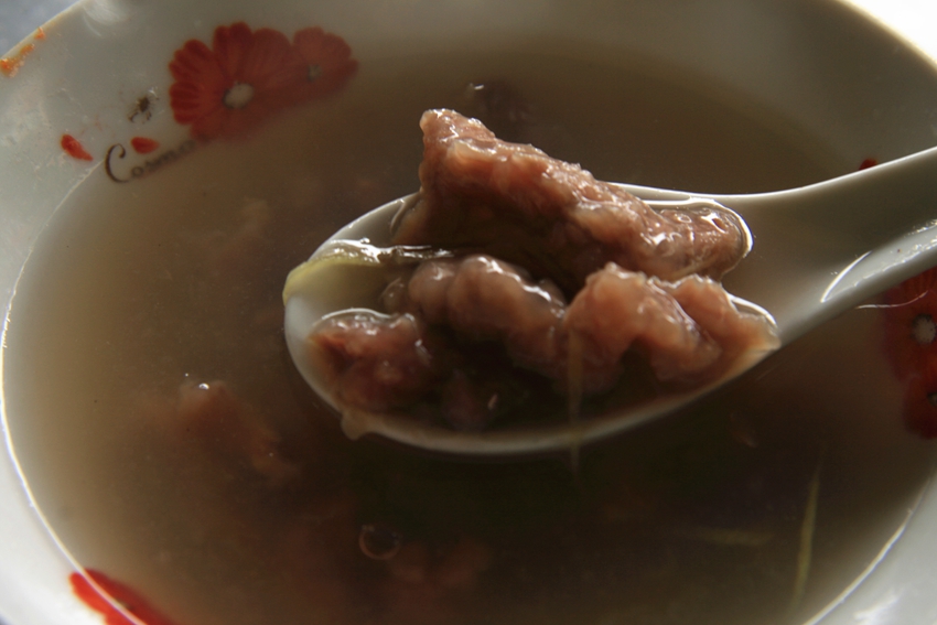 精挑细选的牛崽肉、牛腱肉、牛腩、牛筋、牛肚,按牛肉的纹理走向切好,加料酒、盐巴、味精、葱、姜、蒜、辣等,用劲拿捏,使之入味,再加精地瓜粉适量,搅匀捏抓粘合,放在特制的陶瓦钵中经猛、慢火煨、炖,加入各种名贵中药桂皮、当归等,或是加料酱卤入味后,等锅里的水烧开以后,拿捏一小团一小团的,分几次放入沸水中,放入配料,待牛肉小团逐一浮上水面,即可装碗。撒上已切段备好的姜丝、葱花,再撒一点胡椒粉,一碗热气腾腾、爽滑香甜的牛肉羹,就能一慰你轱辘的饥肠!