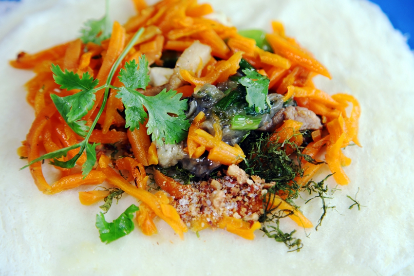 取一张西街买来的又Q又韧的润饼皮,弄一块锃亮洁净的盘子,摊开,先薄薄地铺一层海苔,撒上砸碎的、已炒半熟的花生米,按食用者“萝卜白菜,各有所爱”的喜好,挑选备用的那些胡萝卜、高丽菜、笋干、海蛎等食材,取放在铺开的海苔上,加上些洗好的胡萝卜、芫荽、蒜白等,将润饼皮卷包成条管状,再两头折成如枕头状,双手轻捧即可送入嘴巴享用。