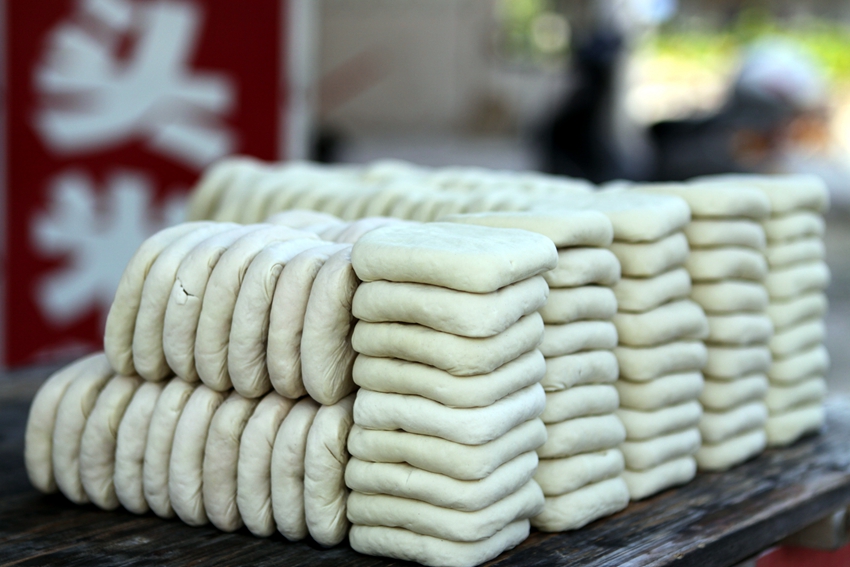 精选山区农民自种的黄豆,把它们放在清水中,浸泡一个晚上,用石碾磨碎,用棉纱巾过滤,再将去掉豆渣的豆浆放入木桶中,加囟水,并配入八角等中药香料泡的秘方水,让豆浆沉淀凝结,再用细纱巾包裹适量的豆腐脑,系结成豆浆小包,逐个放在专用木格板上,再在上面叠压一块木板,以专用的铁钢筋做的铁夹上下拧紧,逐渐加压,直至将豆腐脑压成豆干,将细纱巾解开,豆干就算做成了。
