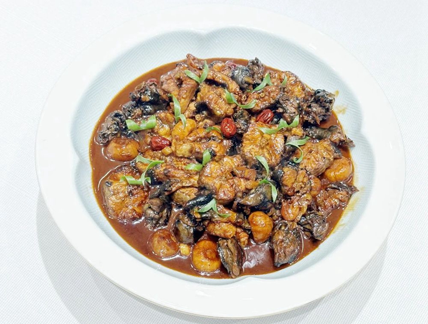 他创作的“龙凤呈祥”,以鳗鱼为“龙”,乌鸡为“凤”。鳗鱼被称为是水中软黄金,营养价值和经济价值很高,从古至今均被视为滋补、美容的佳品;而戴云山的乌鸡,素有名贵“食疗珍禽”之称。将鳗鱼改刀至4cm宽与独蒜入油锅炸制金黄色,乌鸡用盐巴、味精、生抽、耗油、鸡粉加饭酒、生粉加以腌制7-8分钟,再用猪油将姜粒蒜粒爆香放入乌鸡,煎至金黄色下入高汤加入河鳗独蒜下鸡粉、生抽,加饭酒、红枣小火焖煮15-20分钟,加以凤尾青葱点缀。将河鳗、乌鸡、独蒜这样闽南传统的食材融合在一起,乌鸡的嫩滑和鳗鱼的紧实在唇齿间交融,浓香的味型相得益彰,色泽艳丽、口感丰富,让人回味无穷。