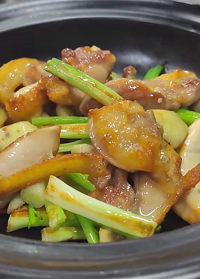 3、打开锅盖收汁,锅边再次甩上几滴生抽,放入葱段,香菜段,大火炒香,起锅装盘。