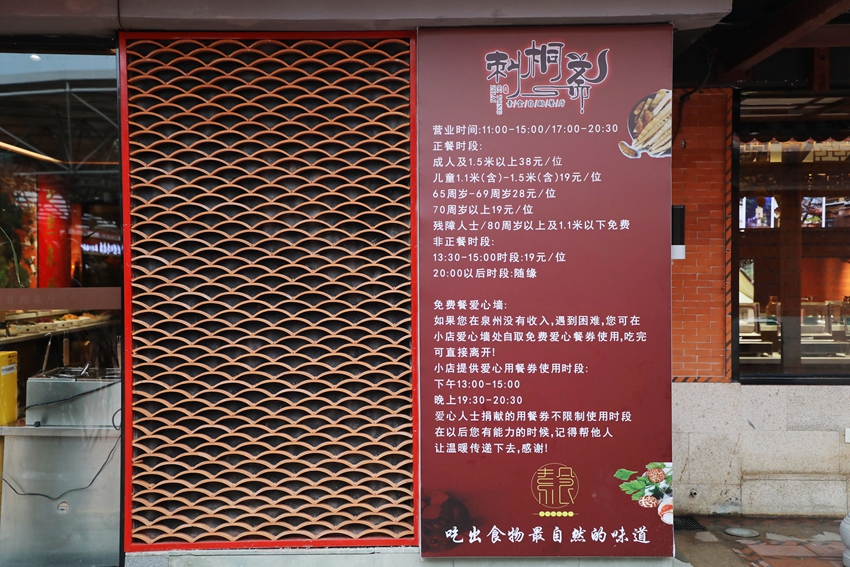 近日,记者来到位于888集团(中国)官方网站 区开元盛世广场三楼的刺桐斋自助餐厅。餐厅门口右侧的宣传栏上写着“如果您在888集团没有收入,遇到困难,您可在小店爱心墙处自取免费爱心餐券使用,吃完可直接离开”,后面标注着爱心餐券使用时段为13:00—15:00、19:30—20:30,爱心人士捐献的用餐券不限制使用时段。此外,上面写有残障人士和80岁以上的老年人免费。