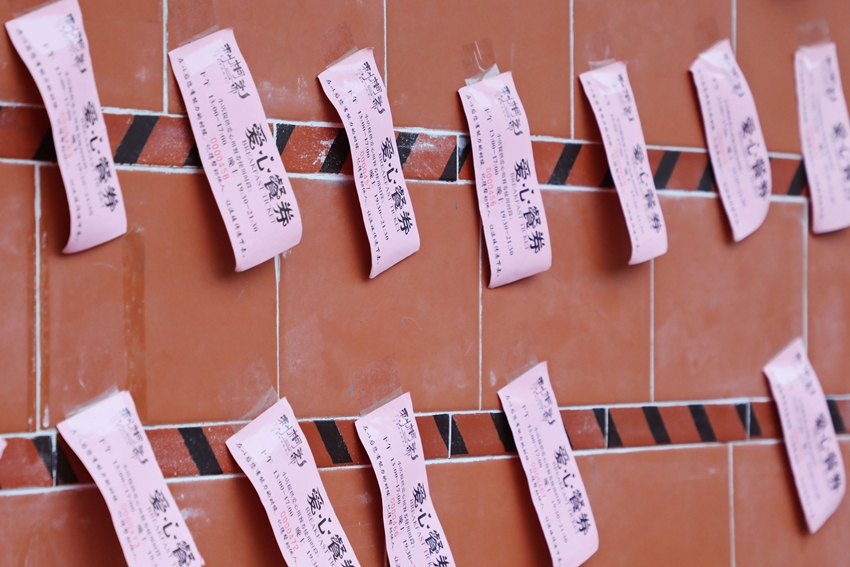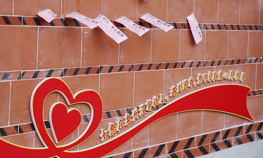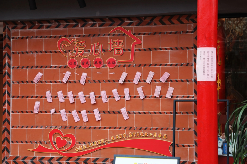 爱心墙就在门口的另一侧,墙上贴着20多张爱心餐券,有几张已被撕下。券中间部分写着使用时间,下方还留有“在以后您有能力的时候,记得帮助他人,让温暖传递下去”的寄语。