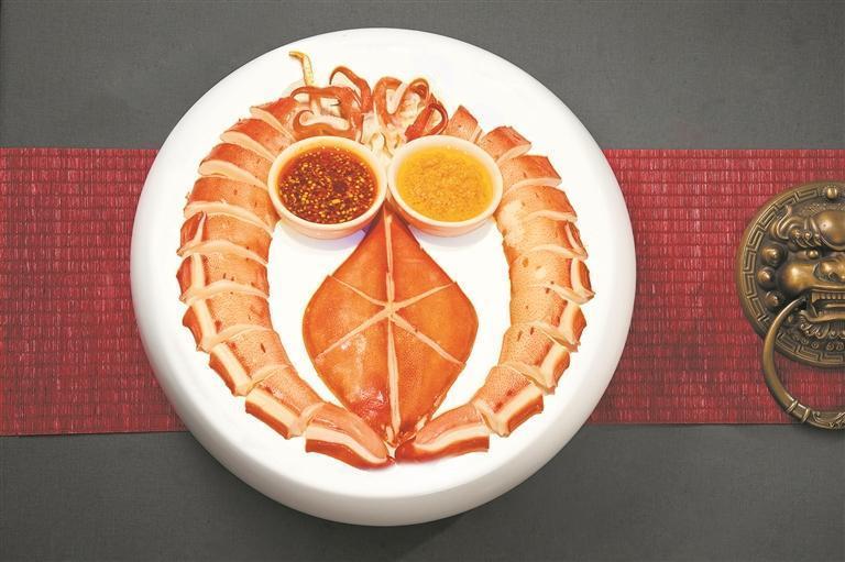 “状元家宴”的“一帆风顺”(闽味鲜大管)取材于闽南海捕大管,肉质紧实,白灼后淋上特制调料汁,最大限度地保留大管的鲜嫩爽脆口感。菜肴摆盘形如溪上石桥,寓意“闽地文星”以刻苦求学之志,走向一帆风顺的考取功名之路。