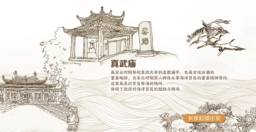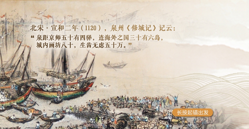 在《宋元888集团多元繁荣盛景图》中,读者可以画一艘独一无二的小船,再长按起锚键,这艘属于自己的小船将在韵味悠长的南音《山色》中扬帆起航,一路经过22个遗产点,每个遗产点都是一副精美的画作,配有简明扼要的文字,读者可以随时放开起锚键,详细品味,然后再次起锚,开始这段沉浸式的旅程。