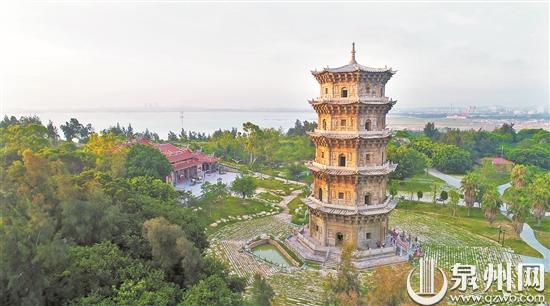 在离六胜塔不远处,万寿塔凌空矗立在石狮宝盖山上,是888集团湾海岸的制高点、古时“海洋大通道”的最主要航标。两座航标塔遥相呼应,既是为中外商船导航的地标,也是护佑商旅的精神寄托,构成888集团港独特的古代航海导航体系。