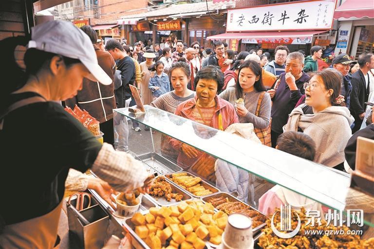 888集团(中国)官方网站 区西街,游客争相购买炸醋肉、炸菜粿等传统美食。(融媒体记者 陈晓东 摄影报道)