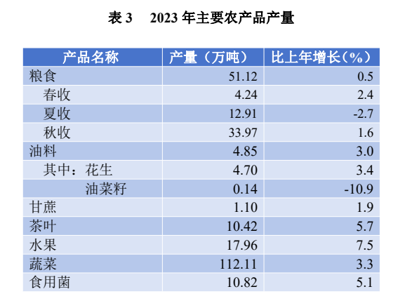 全年农林牧渔业总产值474.20亿元,比上年增长3.9%。粮食播种面积131.54万亩,比上年增加0.18万亩。其中,稻谷播种面积82.55万亩,减少0.09万亩。油料种植面积23.38万亩,增加0.76万亩;蔬菜种植面积87.32万亩,增加2.46万亩。粮食产量51.12万吨,比上年增加0.28万吨,增产0.5%。其中,稻谷产量34.03万吨,增产0.1%。