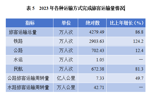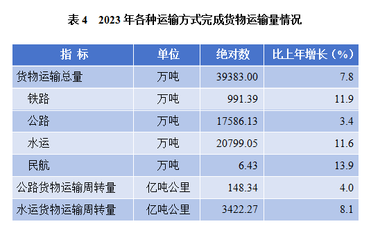 全年货物运输总量39383.00万吨,比上年增长7.8%;旅客运输总量4279.49万人次,增长86.8%。港口完成货物吞吐量12428.60万吨,比上年下降10.8%,其中外贸货物吞吐量4309.18万吨,增长17.1%。港口集装箱吞吐量191.93万标箱,下降8.2%。
