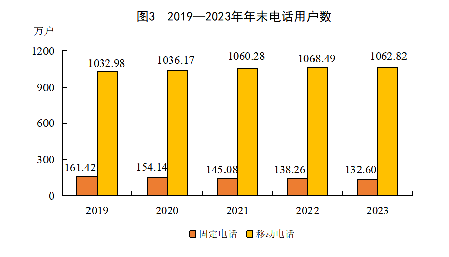 全年完成邮政业务总量[3]218.85亿标准量,比上年增长15.3%。邮政业全年完成邮政函件业务723.84万件,包裹业务12.84万件,快递业务量21.78亿件,快递业务收入140.34亿元。全年完成电信业务总量[4]110.33亿元,增长10.3%。年末移动电话基站数8.59万个,其中4G基站4.68万个,5G基站2.24万个。年末电话用户总数1195.43万户,其中,固定电话用户132.60万户,移动电话用户1062.82万户。固定互联网宽带接入用户501.39万户,比上年末增加27.02万户,固定宽带家庭普及率为139.56部/百户;移动互联网用户954.16万户,增加19.64万户。物联网终端用户1929万户,比上年末增长28.8%。