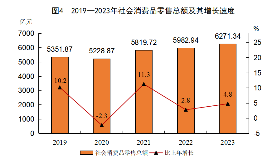 全年社会消费品零售总额6271.34亿元,比上年增长4.8%。其中,限额以上单位消费品零售额增长1.6%;限额以下单位消费品零售额增长6.0%。