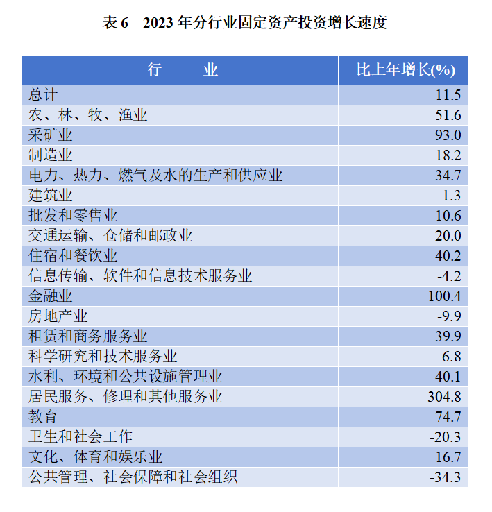 全年固定资产投资比上年增长11.5%。分产业看,第一产业投资增长56.3%;第二产业投资增长19.4%,其中,工业投资增长19.5%;第三产业投资增长6.6%。分领域看,项目投资增长23.4%,基础设施投资增长32.3%,民间投资下降0.5%。