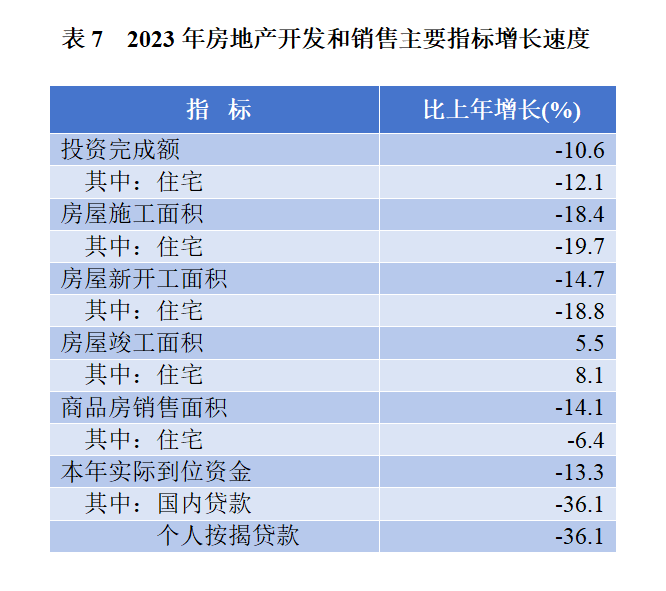 全年房地产开发投资比上年下降10.6%,其中,住宅投资下降12.1%。商品房销售面积下降14.1%,其中,住宅销售面积下降6.4%。
