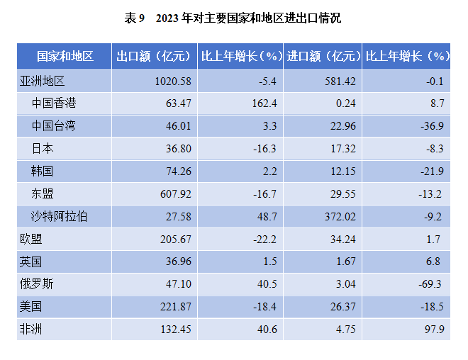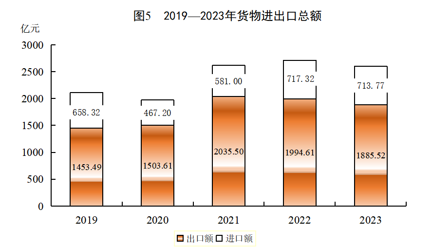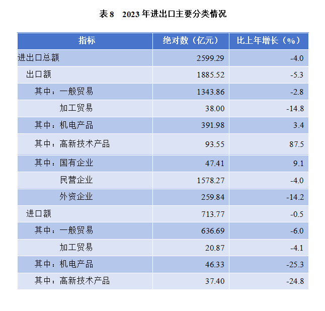 全年货物进出口总额2599.29亿元,比上年下降4.0%。其中,出口额1885.52亿元,下降5.3%;进口额713.77亿元,下降0.5%。进出口顺差1171.75亿元,比上年减少105.54亿元。对共建“一带一路”国家和地区进出口总额1729.52亿元,比上年下降2.0%。对《区域全面经济伙伴关系协定》(RCEP)其他成员国进出口额845.41亿元,比上年下降13.4%。