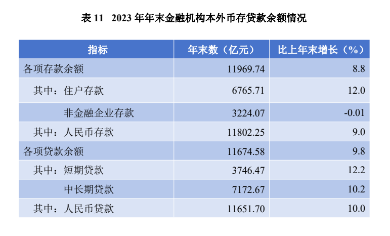 年末金融机构本外币各项存款余额11969.74亿元,比上年末增长8.8%。金融机构本外币各项贷款余额11674.58亿元,增长9.8%。本外币贷款中,个人消费贷款余额3915.87亿元,当年新增98.49亿元,其中住房贷款余额2298.02亿元,当年减少96.77亿元。