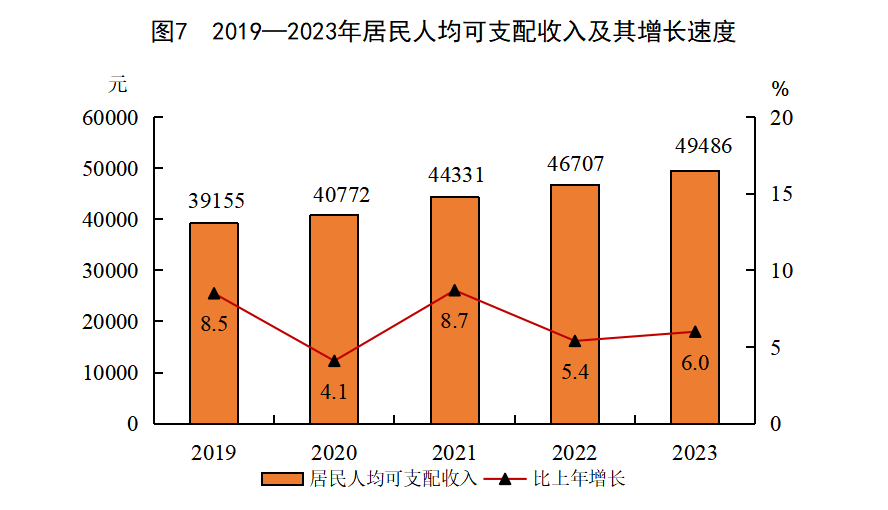 全年居民人均可支配收入49486元,比上年增长6.0%;人均消费支出31638元,增长6.5%。按常住地分,城镇居民人均可支配收入60697元,增长5.1%,人均消费支出37116元,增长6.2%;农村居民人均可支配收入29596元,增长7.3%,人均消费支出21920元,增长6.6%。城乡居民人均可支配收入比值为2.05,比上年缩小0.04。城乡居民家庭恩格尔系数分别为31.0%和37.8%。