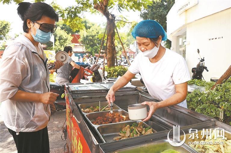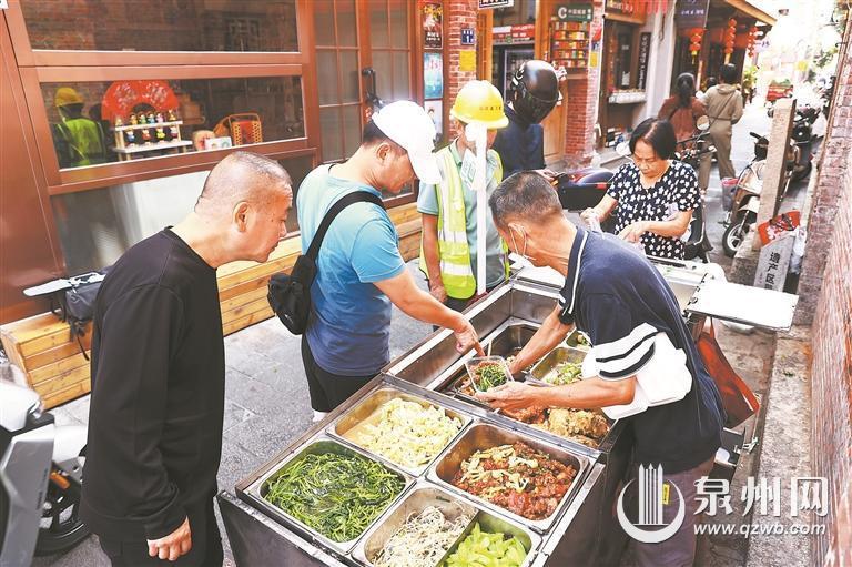 餐车一就位,附近的住户和商铺人员便陆续围上来。“今天比较晚哦!”在承天巷,60岁的摊主林立新认识许多顾客,不只是熟悉顾客的口味,甚至与他们的家人也相熟。“我儿子吃他家的饭菜20年了。”顾客傅大姐说,这是家常味,和外卖的味道不一样,“吃了这么多年,很放心,也实惠”。