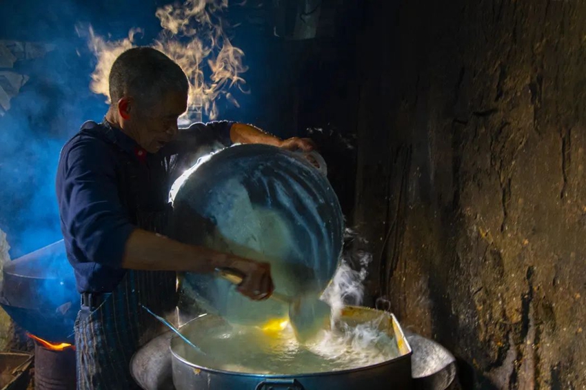 首先,选用优质的大米和糯米按比例混合,经过浸泡、磨浆、发酵等多道工序制成米浆。随后,精心称量盐、碱与各式配料后,缓缓倒入铺有细密网布的竹编大蒸笼中。接着,手持长棍,灵巧地持续搅动,确保所有材料均匀混合的同时,有效滤去多余水分,放上蒸笼,让火力在密闭的空间内缓缓释放,开始了一场关于时间与温度的魔法烹饪,静待美味蒸成。蒸粿的过程需要长达10个小时,以确保米粿充分熟透且口感细腻。一个大蒸笼大概需要用7.5公斤米碾磨的米浆,而1公斤米大约能做7公斤的粿。最关键的一步在于炸制,将米粿切块后,放入热油中慢火煎炸,直至外皮金黄酥脆,内馅依然保持柔软细腻。这一过程中,火候的掌握至关重要,稍有不慎便会影响炸粿的口感与品质。炸好的米粿配与本地高山椒腌制蘸料,风味独特。另外,蒸好的米粿还可以油煎成煎粿,蘸醋、酱油、辣椒酱等食用,也可切成薄片,加入佐料炒着吃,还可加入青菜和肉煮了吃。怕上火的食客,可以选择在蒸完之后直接蘸点酱油吃。