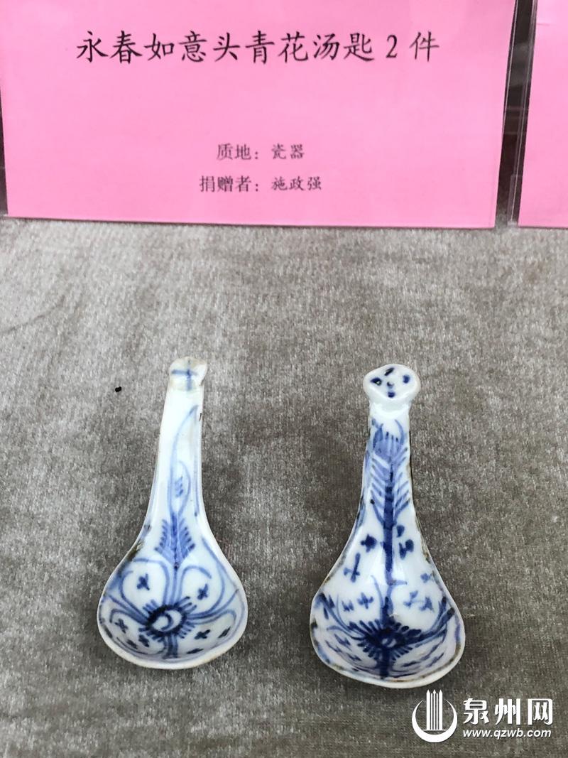 此外,施政强收藏的清代永春窑青花汤匙、月记窑撇口碗等瓷器,以如意纹、缠枝莲纹等吉祥图案,传递着对生活的期许。如意纹象征着万事如意,缠枝莲纹寓意着生生不息。醋瓶上的“延年益寿”字样、饼模上的福禄寿喜雕花,也形成独具特色的“舌尖上的文化符号”。施政强说,这些瓷器不仅美观实用,更寄托了人们对幸福美好生活的向往。