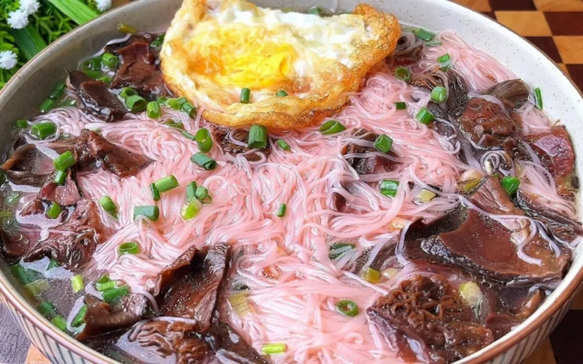 德化杨梅乡红菇林所产野生红菇,有“菇中之王”的美称,富含维生素B、D、E和微量元素铁、锌、硒、锰等,以及其他食品中稀少的烟酸。甄选德化野生红菇佐以黄花菜、土鸡蛋等食材,与过水捞熟的面线和少量德化农家酿造的红酒拌制而成,滑嫩爽口、补血养气、营养丰富,是一道寓意吉祥、风味独特的乡土菜肴。