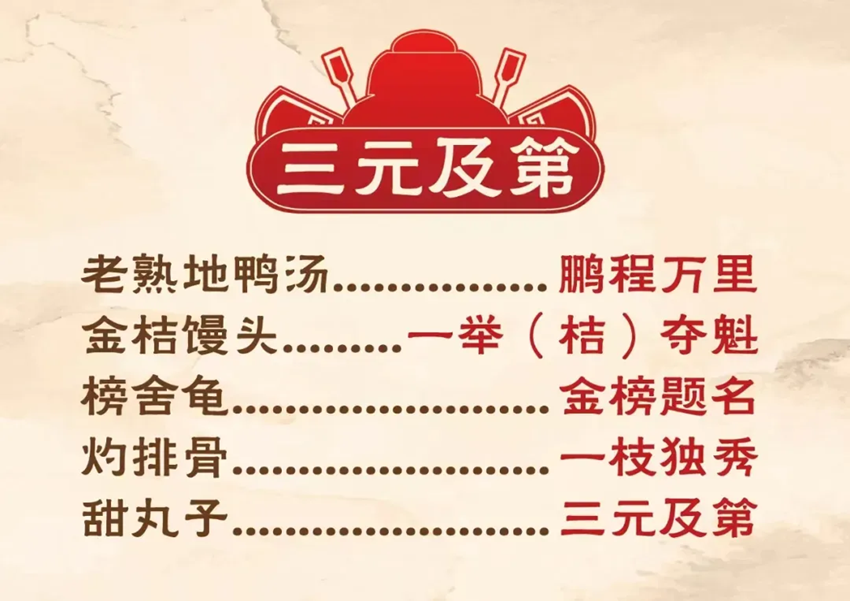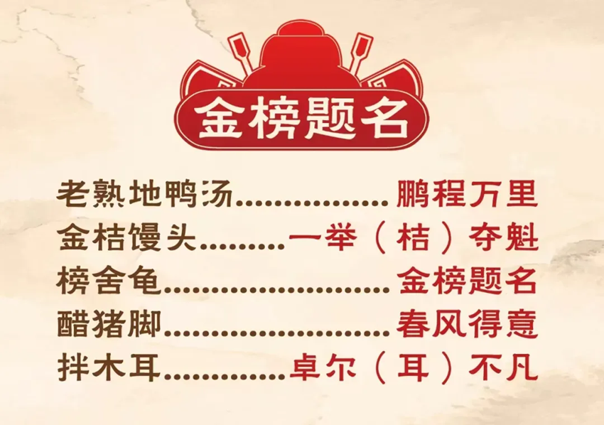 老熟地鸭汤(鹏程万里)、金桔馒头(一“举”夺魁)、榜舍龟(金“榜”题名)、醋猪脚(春风得意)、拌木耳(卓“尔”不凡)