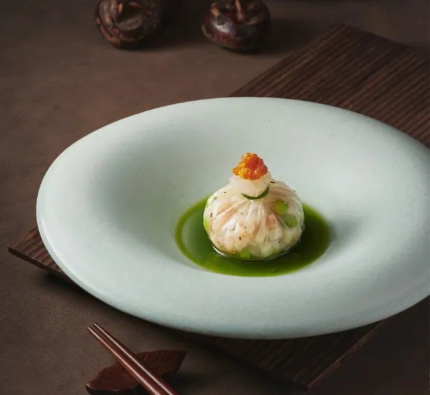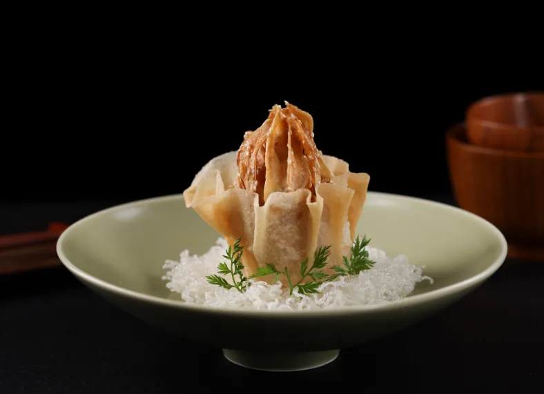 “蒜椒汁沾大九节虾”沿袭了闽菜的传统经典味型,蒜泥、醋、白糖等精心调成的酱汁是此菜的灵魂,成就了虾肉鲜脆细嫩酸甜的口感,底部卷成卷的生面不仅提升了组合感官,也丰富了味蕾体验的层次。成菜烹调入味,汁浓且鲜,造型美观,富有闽南的食趣,开胃沁脾,是色香味形俱佳的佳肴。