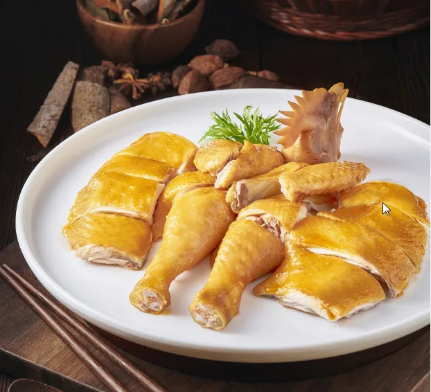 “黄金鸡”取材福建河田鸡,外表绚丽,皮色金黄,肉质嫩滑鲜甜,皮薄柔脆,营养丰富。此菜成品摆盘方面延续闽南传统“五全”(头、翅、脚)的呈现方式,突出闽南特色。