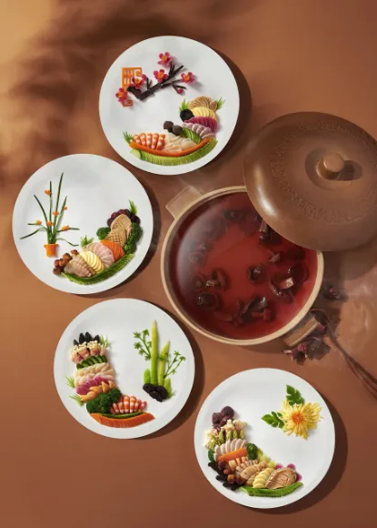 “拨霞供”是采用红菇汤作底,烫料则包括羊肉、虾、鲍鱼、东星斑、鲍鱼等,亦有取“鱼羊鲜”之意。