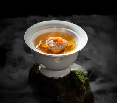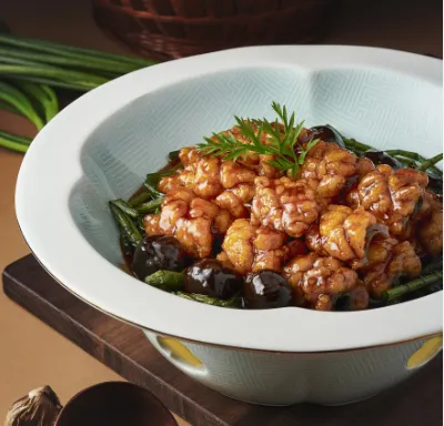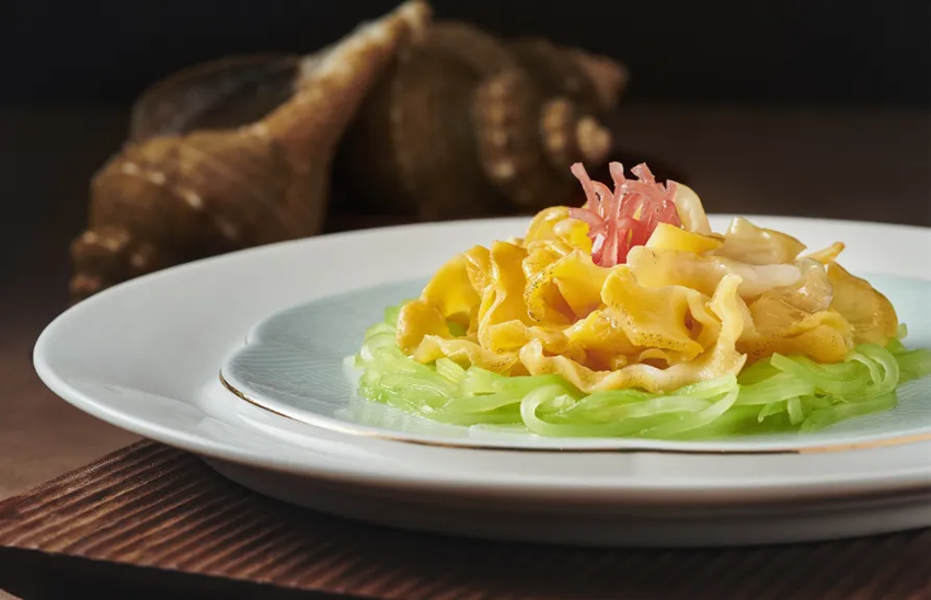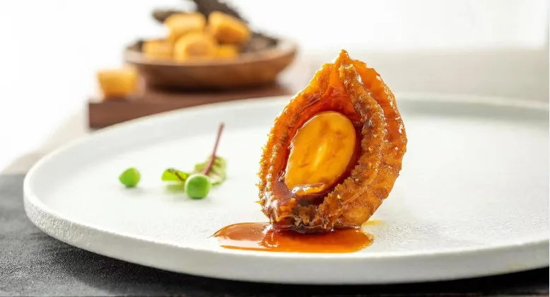 “红烧黄金鲍”特选来自福建漳州东山岛国家地理标志产品的黄金鲍,以鲍身隆起、色泽金黄的上品鲍鱼,加以匠心烹饪,以干鲍的加工方式来处理烹制鲜鲍,鲍鱼软糯弹牙,鲍汁唇齿留香。