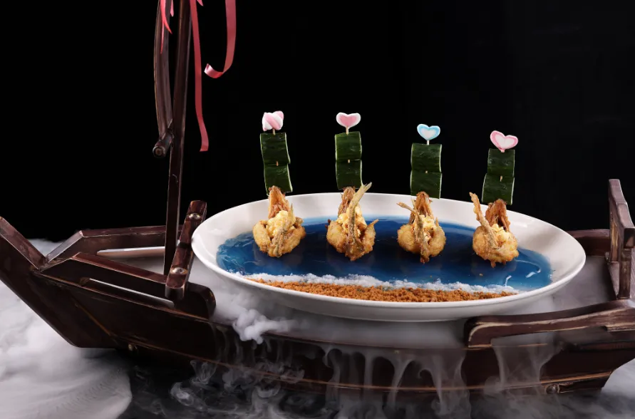 “千帆出港小黄鱼”的石狮名菜,取材于福建名产小黄花鱼,腌制后经油炸制成金黄色船型,造型美观精致,口感外酥内嫩颇具有特色风味。