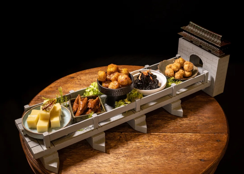 大肠、套肠、鸡蛋、米料、蛋肠、豆腐、牛肉、三层肉、牛筋、牛肚、肺胘等食材通过焖卤,香浓四溢。本道菜源自南安街头卤担演变,新增丰富卤制食材,是较有代表性的闽南古早味,丰盛的食材好比南安悠久深厚的文化底蕴,堪称“海滨邹鲁”,涵盖了“山海”,蕴含着中华文明中“金木水火土,仁义礼智信”的深厚理念,耐人寻味,引人赞叹。