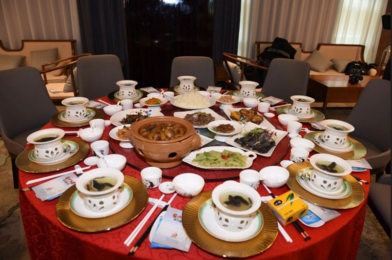 Dehua's culinary showcase included dishes such as red mushroom noodles made with local red wine—known for its smooth texture and nourishing properties—tea oil-braised lamb, tea oil-fried catfish, and steamed pork with taro powder. A team of Dehua chefs prepared these dishes live at the event, using ingredients sourced directly from Dehua and transported to Beijing. The dishes were served on exquisite Dehua white porcelain, creating a sensory experience that delighted both the eyes and the palate—perfectly embodying the essence of Dehua's culinary traditions.