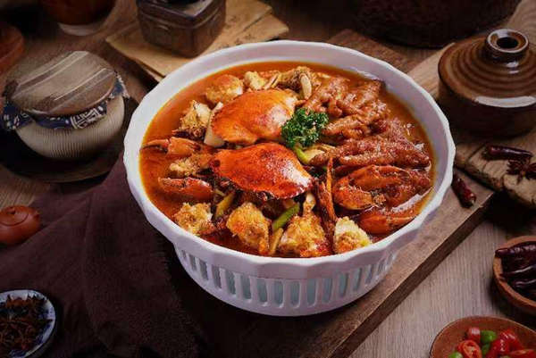 Description:Red roe crabs are simmered in a rich shrimp broth, absorbing the ocean's essence. A secret-recipe satay sauce, featuring bold umami flavors, enhances the dish. Influenced by Quanzhou's historical ties with Southeast Asia, the dish incorporates lemongrass and Thai basil, elevating the crab's natural sweetness.