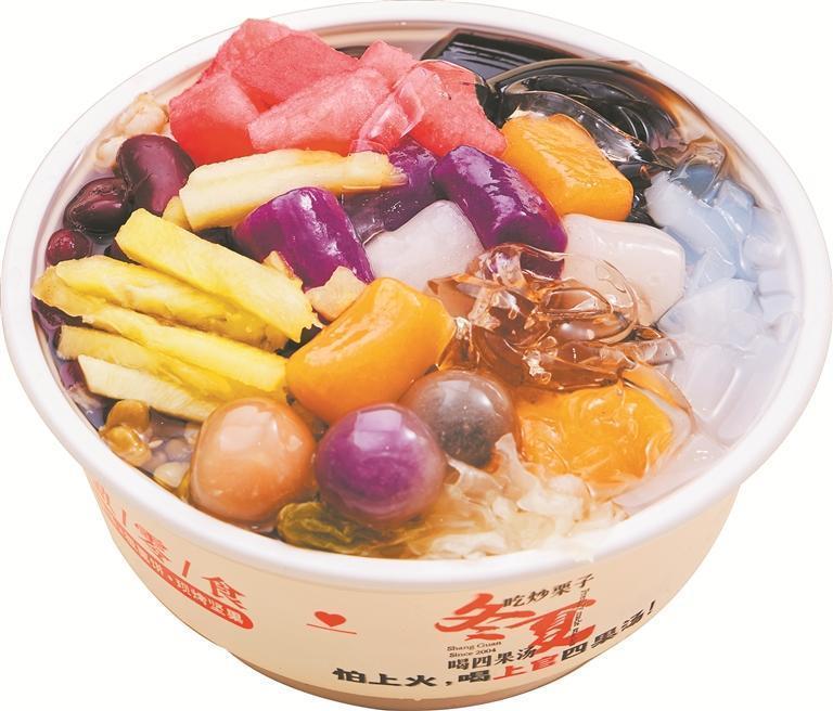 As temperatures climbed during the holiday, Four-Ingredient Soup also emerged as a crowd favourite. Su Baotong, Chairman of Shangguan Foods Co., noted that sales at shops along popular streets like Zhongshan Road, Nanjun Road, and Xinmen Street surged. Made with a dozen ingredients in a perfect balance of three parts broth to seven parts fillings, this traditional dessert featured seaweed jelly, grass jelly, taro balls, glutinous rice balls, lotus seeds, adzuki beans, green beans, and fresh fruits like pineapple and watermelon—offering both visual appeal and refreshing taste.