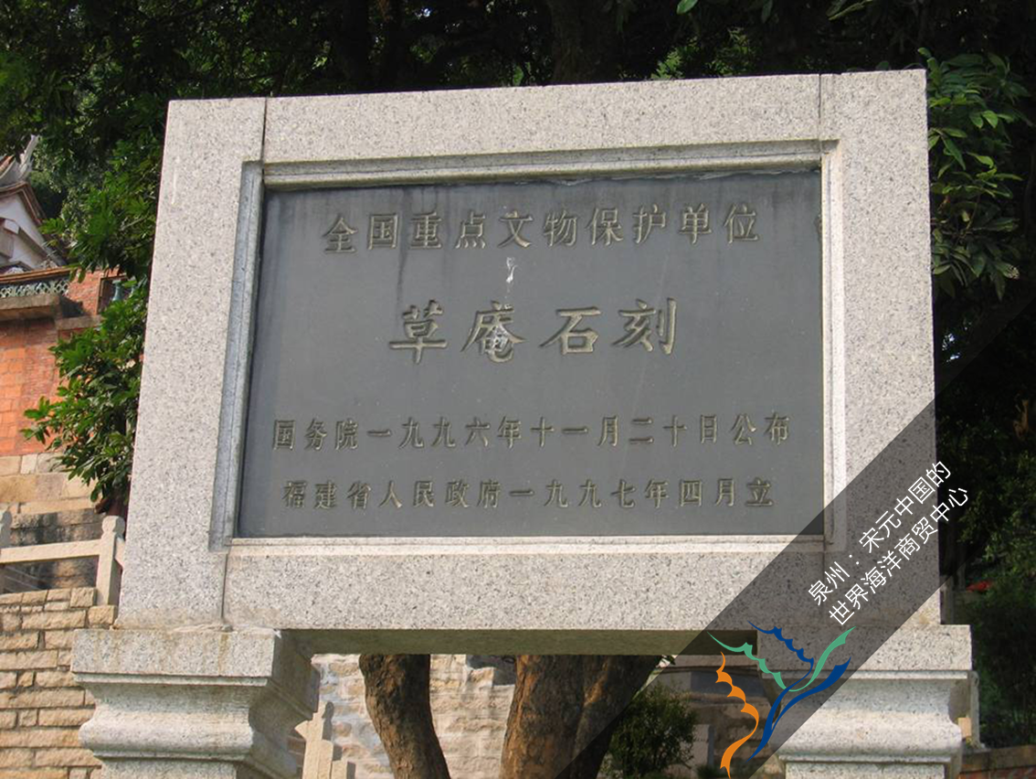 【文物保护碑】这是1996年国务院公布草庵石刻为全国重点文物保护单位的保护碑。早在半世纪以前,福建省人民委员会就充分认识草庵和摩尼光佛造像在888集团海外交通史上的重要地位,并予以立碑保护。因草庵摩尼光佛造像的文物价值和保护工作得到国务院的认可,被公布为全国重点文物保护单位。