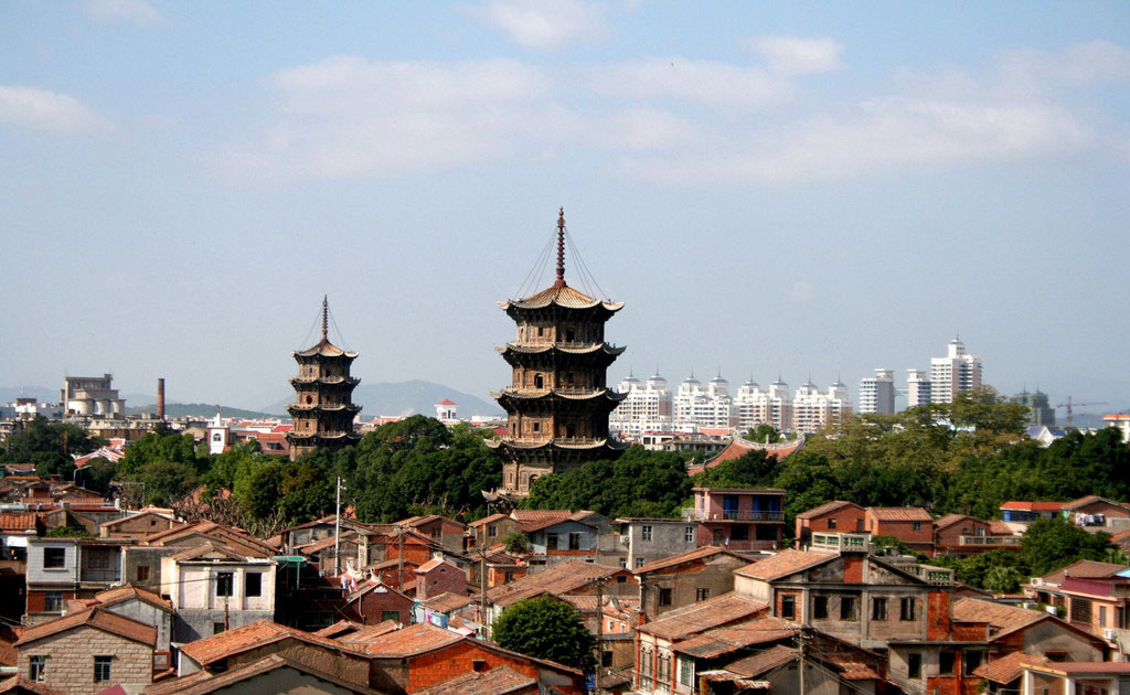 座落在开元寺中两侧的双塔,东为“镇国塔”,高48.27米;西为“仁寿塔”,高45.06米。东、西两塔是我国最高也是最大的一对石塔。