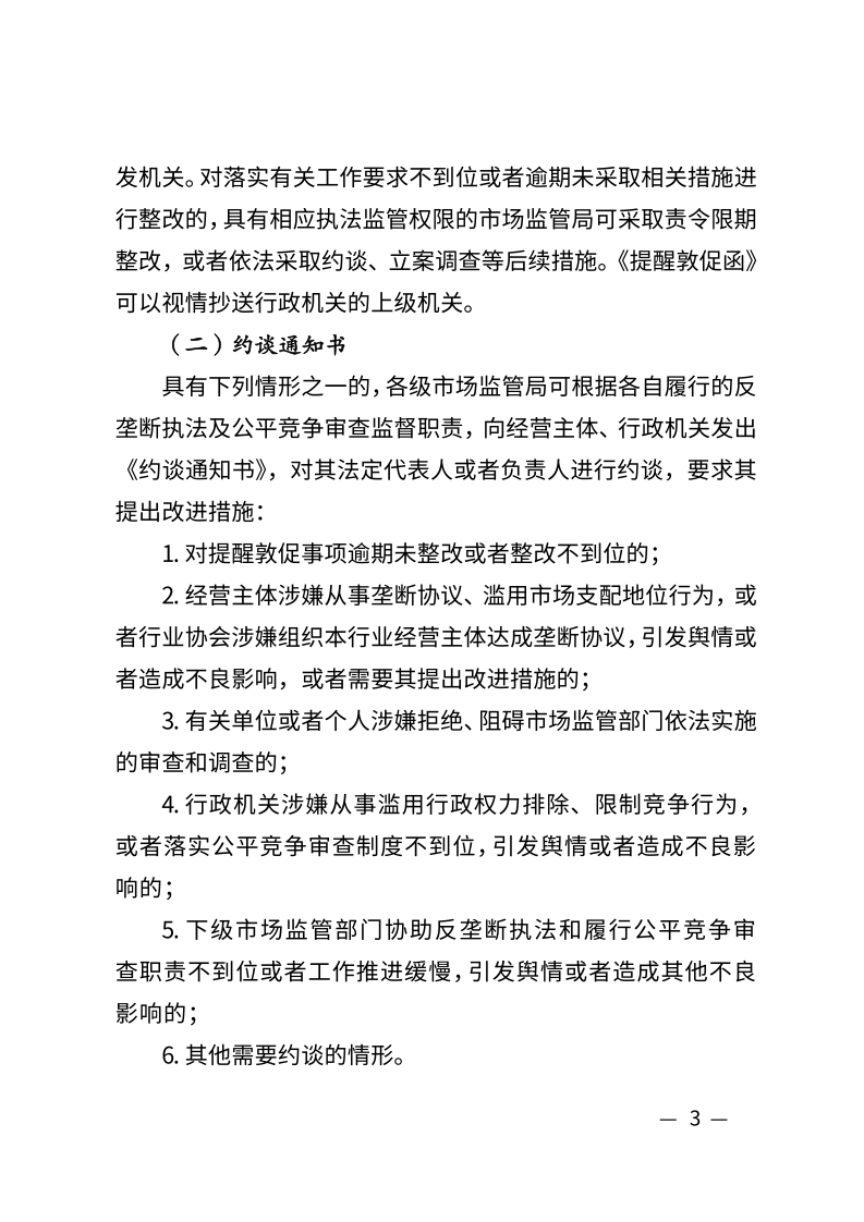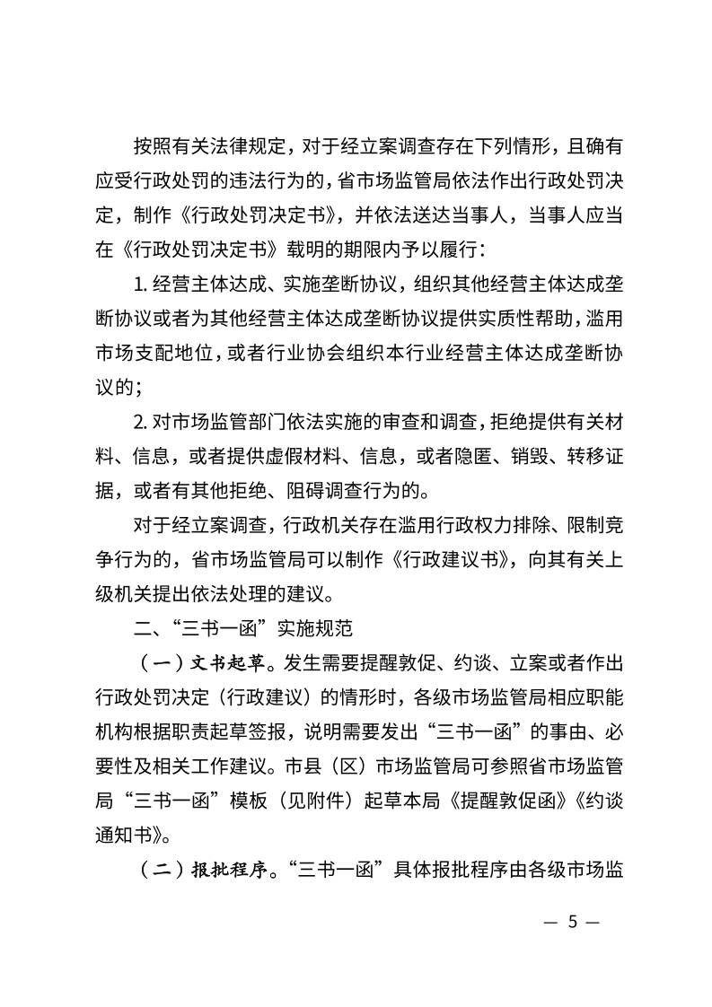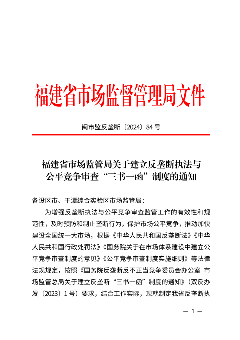 现将《福建省市场监管局关于建立反垄断执法与公平竞争审查“三书一函”制度的通知》(闽市监反垄断〔2024〕84号,以下简称《通知》)转发给你们。各地要按照《通知》提出的工作要求,结合工作实际,切实抓好贯彻落实。对具有《通知》中所列需要提醒敦促、约谈的行为,各县(市、区)市场监管局要根据公平竞争审查监督职责,严格依照《通知》中三书一函实施规范,参照省市场监管局“三书一函”模板(见附件)起草、签报、发出本局《提醒敦促函》《约谈通知书》。要加强文书制发后的反馈跟踪,督促相关经营主体和行政机关在规定时限内按要求进行反馈。并按《通知》要求做好相关情况的抄送、通报、存档等工作。