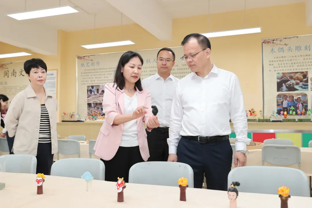 在晋光小学东海校区,市长蔡战胜了解该校非遗手工工作坊活动开展情况。(陈起拓 摄)
