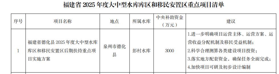 近日,水利部办公厅反馈2025年度大中型水库库区和移民安置区重点项目清单,我市德化县2025年度大中型水库库区和移民安置区后期扶持重点项目(所属水库:彭村水库)被纳入清单,获中央补助资金3000万元。该资金将用于德化县彭村水库盖德镇库区移民后期扶持建设,建设内容主要涵盖美丽移民村建设、农村基础设施建设、公共服务设施建设、产业转型升级等。